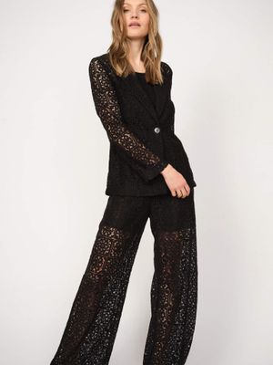 These undeniably enchanting pants are designed in a chic boxy fit with a flattering mid-rise silhouette. Crafted from delicate, feminine see-through lace, they offer a refined appeal, completed with a sleek hook and zipper closure. The addition of inner shorts ensures comfort and coverage, striking the perfect balance between elegance and wearability. Style them with the matching lace blazer for a polished and glamorous going-out ensemble, or dress them down effortlessly with an oversized tee for a contemporary, casual twist on a romantic look.