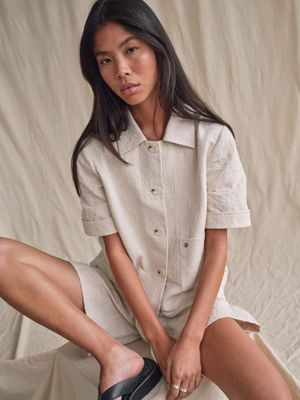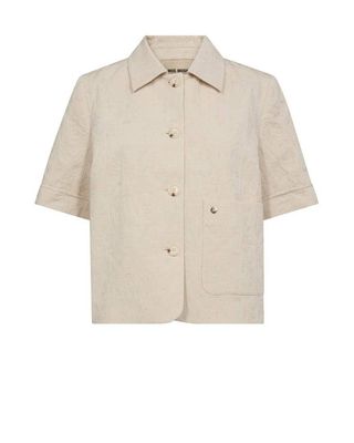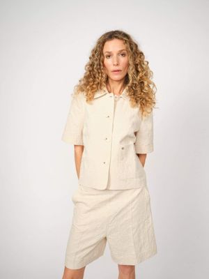 Make a statement with this stunning jacquard woven jacket, crafted from a luxurious blend of soft cotton and silky viscose. Designed in a slightly boxy silhouette, it exudes effortless sophistication with its timeless shirt collar, buttoned front, and chic rolled-up sleeves. The addition of a single front pocket adds a touch of utility-inspired charm, while the intricate jacquard pattern elevates its refined aesthetic. Pair it with the matching shorts for a coordinated ensemble that’s both trendy and elegant, perfect for turning heads during summer outings.