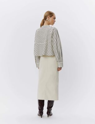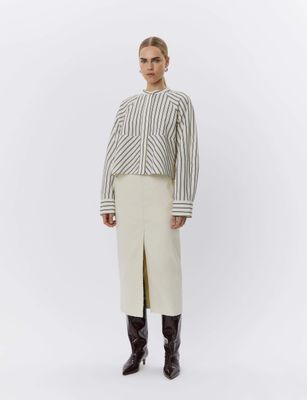 This cropped, button-down shirt has a hidden button closure and buttoned cuffs. The shirt has a regular fit. The model wears a size 36 and is 179 cm tall.