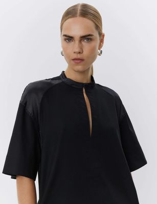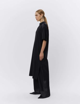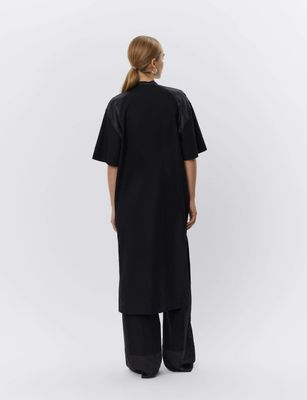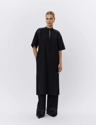 This kaftan-style dress features a V-neck with button up, sleeves to elbow, and slits at the sides. The dress has a loose fit. Model size: 36. Model height: 179 cm.