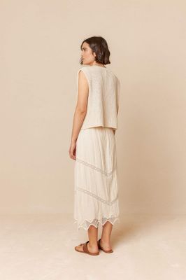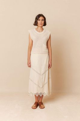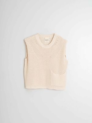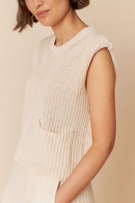 The English knitted vest that combines with any garment. It has a fitted shoulder and tucked armhole, creating a shoulder pad effect that will elevate your look to the max.