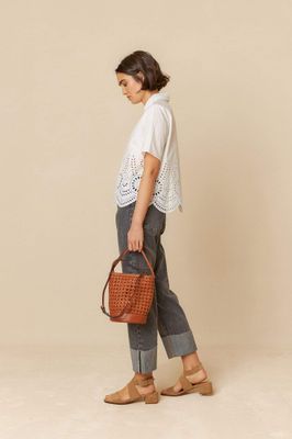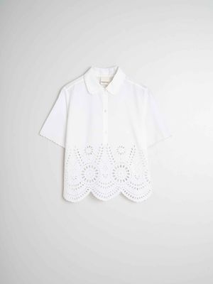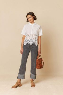 Crop shirt in cotton poplin embroidered and trimmed by hand. It has scalloped sleeves and hem. A very INDI garment.
