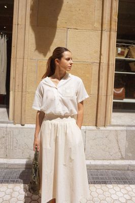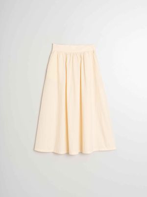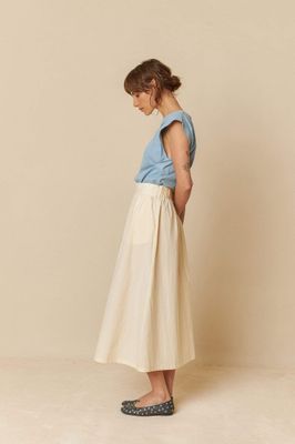 Our organic cotton poplin midi skirt has a high waist with elastic at the back, a side zipper closure and hidden pockets in the side seams.