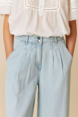 Crafted in washed-denim effect Lyocell, these pants combine style and functionality. The waistband with belt loops and zipper and button closure ensures a perfect fit. The French-cut front pockets and double front darts add a touch of elegance, while the relaxed fit provides all-day comfort.