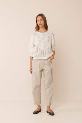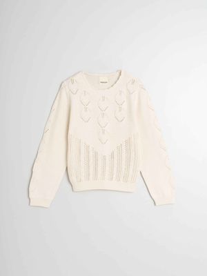A basic with unique details, this crochet sweater combines comfort and style. Fitted shoulders, along with ribbed finishes at cuffs and hem, ensure a comfortable fit. Crochet-effect floral details on the top and sleeves, mixed with embroidery on the bottom, create a design full of texture and personality.