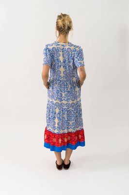 • Beautiful blue print with subtle red hues and a red hem