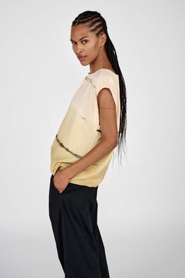The blouse is defined by a relaxed fit with small sleeves and a feminine neckline. The material is light and breezy making it perfect in the warm weather wardrobe.