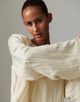 This top features a fringed texture throughout, a keyhole with button closure at the back, and side sleeves. There is a fringe across the hem and wrists. The top has a loose fit.