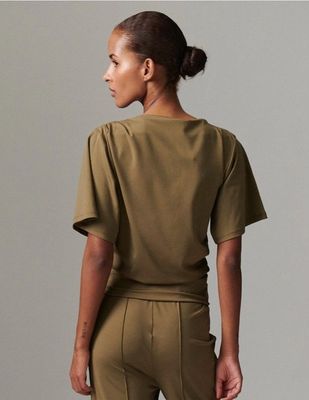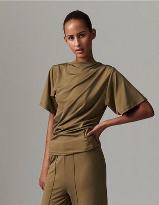 This stretchy boatneck top features short sleeves and ruching at the sides. The top is fitted.