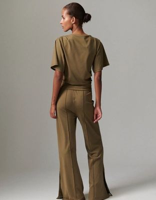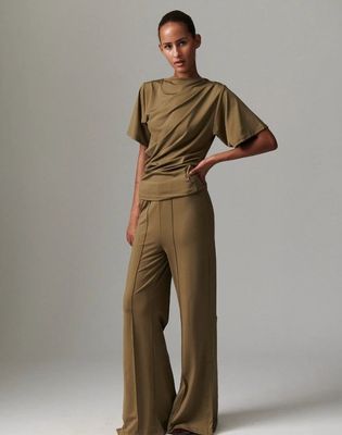 These high-rise, wide-leg trousers feature an elasticated waistband, raised seams down the middle of the leg, and slits at the ankles. These trousers are fitted at the waist.