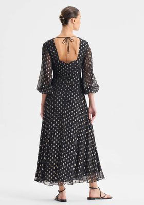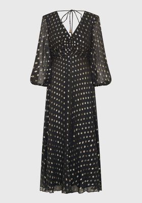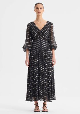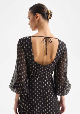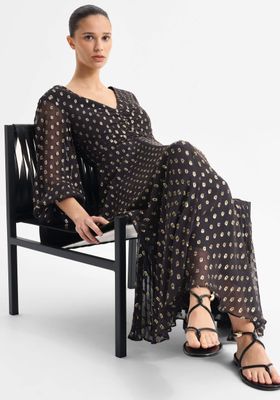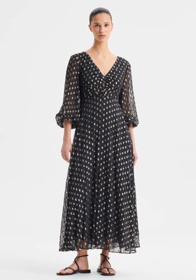 The Cecile Midi Dress is crafted from shimmering gold lurex georgette, offering an effortless balance of elegance and movement. Featuring a V neckline, voluminous 3/4 sleeves, and ruching at the front and side bodice, it creates a flattering silhouette. Finished with a fine tie and invisible zip at the back, this midi-length swing dress is fully lined for comfort and ease.