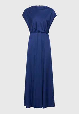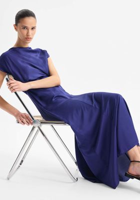 The Fredrika Dress showcases soft structure and elegant detail in a silk blend satin. Featuring a high neck and keyhole tie opening, it’s defined by gathering from one shoulder and waist tucks that create a flattering drape. A slight swing midi hem completes this timeless, feminine silhouette.