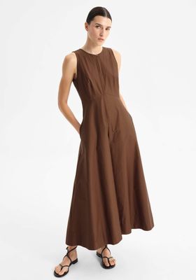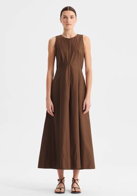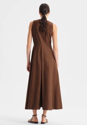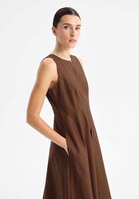 The Brooks Dress is crafted from crisp cotton poplin, offering both structure and comfort. Featuring a crew neckline with a keyhole front opening, it’s designed with a fitted bodice and pleated A-line skirt for effortless volume and movement.