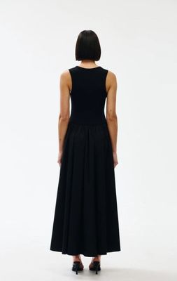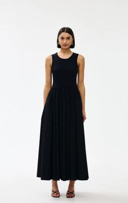 This sleeveless silhouette features a high neckline and a gently fitted waist that flows into a softly flared skirt.