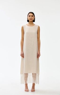 Crafted from a breathable, linen fabric, this sleeveless midi dress features a relaxed silhouette that drapes beautifully on the body. The minimalist design is elevated with a beautiful macramé look fringed hem, adding a touch of charm and movement to each step.