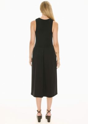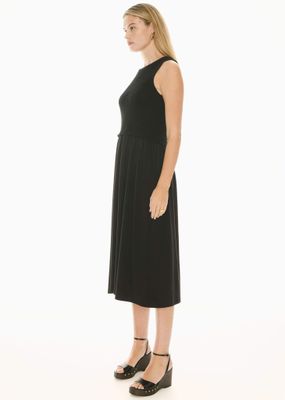 With a textured stripe knit bodice and a jersey skirt, the Bonde Knit Dress is an easy to wear piece for Summer. Round ribbed neckline. Sleeveless design. Regular fit through the bodice - knit design has soft stretch. Ribbed detail at the bottom of the bodice gives the illusion of a two piece set. Skirt features soft gathers from the top. Hip pockets. A-line shape. Midi-length.