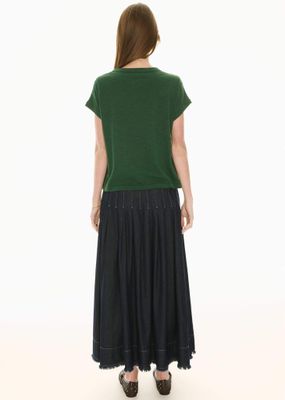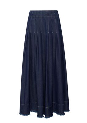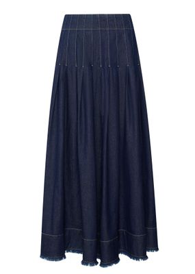 The Doyle Denim Skirt features pleated detailing over the hips for an elevated take on a wardrobe classic. Lightweight non-stretch denim. Sizing runs large as this style is designed to be worn on the hip - if you want to wear it higher we recommend ordering one to two sizes down. Please check measurements at the bottom of the description. Fixed waistband. Metal zip closure at the side seam. Stitched down knife pleat detail over the hips, flaring out into a full silhouette. Raw edge hems with fringe detailing. Maxi length. Designed to wear on the hip - we recommend sizing down if you want to wear it higher