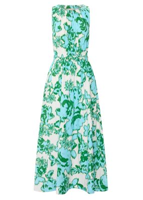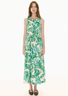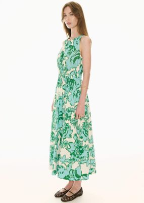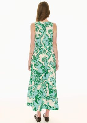 Featuring two exclusive European prints, a gathered neckline and an elasticised waistband, the Jaine Tank Dress is an elevated pop on piece perfect for daywear. Slip on style. Round neckline - elastic detail at the front and back creates gathers through the bodice. Blouson fit through to the waist. Sleeveless design. Elasticised waistband for a cinched in look that is comfortable. Hip pockets. Skirt gathers at the waistband before flaring into an A-line silhouette. Side splits at the hem. Maxi length. Available in Donut Palm and Static Floral Prints. Also available in plain colours in the Eira Tank Dress.
