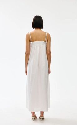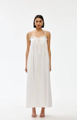 Designed with a softly gathered bodice, tie-front detail, and slender adjustable straps, this maxi silhouette flows beautifully with every step.
