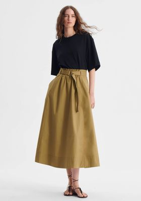 The Romy Skirt is crafted from midweight cotton poplin with a semi-elasticised waistband for comfort and ease. Designed with front hip pockets and a flared silhouette, it falls to a versatile midi length. Complete with a self-fabric waist belt, this skirt offers a polished, effortless finish.
