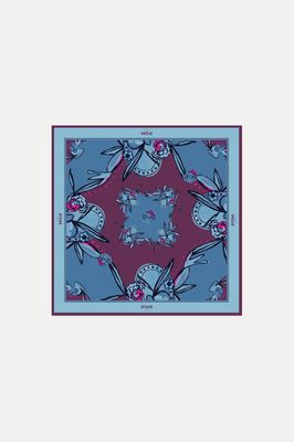 A square silk scarf with a mysterious edge. The deep blue and dark purple hues combined with illustrated flowers make this an elegant accessory with character. Tie it in your hair, on your bag, or around your neck.• Deep blue & dark purple • Illustrated floral print • Square design • 100% silk