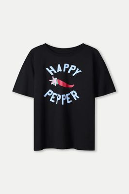 Black T-shirt made of 100% organic cotton with a striking print: a chili pepper and the text "Happy Pepper." Comfortable and full of character.• Black/Blue/Red/Pink/Green • Text print on the front • Crew neck • Short sleeves • Regular fit • 100% organic cotton• Sustainable