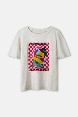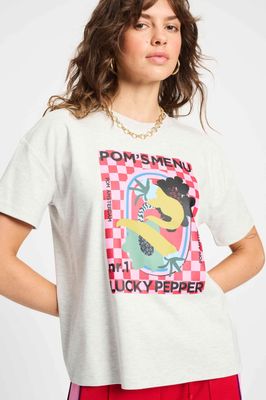 On the menu: style with taste. This heather gray T-shirt features a colorful front print full of food art, checkerboard vibes, and the text "Lucky Pepper."• Gray/Pink/Red/Mustard Green • Front print • Crew neck • Short sleeves • Boxy fit • More sustainable