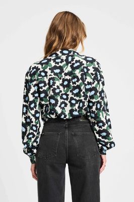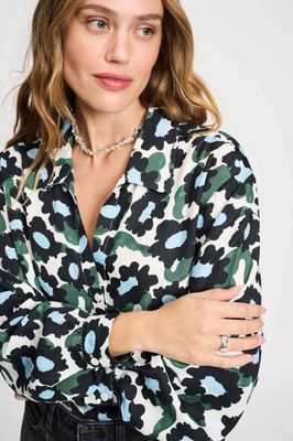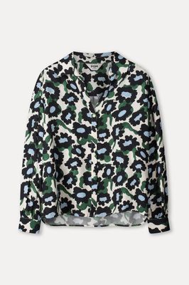 A bold blouse, the abstract floral print in blue and black contrasts powerfully with the ecru base. • Ecru/Black/Blue/Green • Floral print • Classic collar • Long sleeves • Straight fit • Button placket at the front