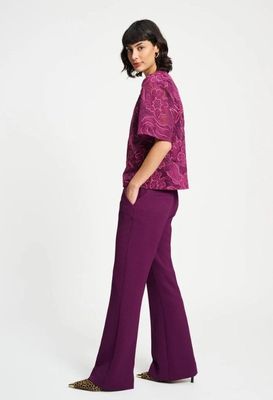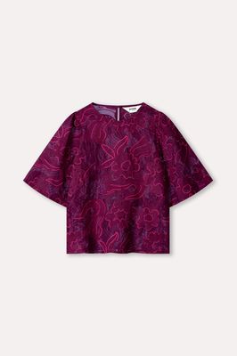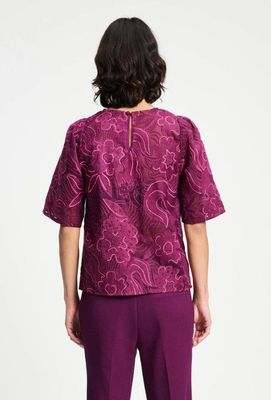 Plum power. This organza top with embroidered flowers and wide sleeves makes any look special without any effort.• Dashing plum color • Tonal floral pattern • Round neck with slit and button at the back • Mid-length wide sleeves • Slightly sheer • More sustainable