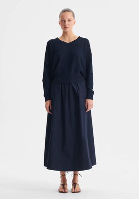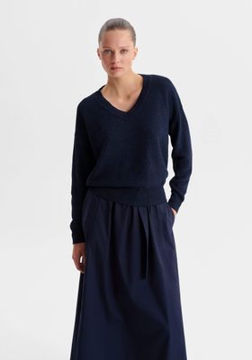 The Marli Knit Pullover is crafted from a soft cotton-paper blend yarn, featuring a timeless V-neck and full-length sleeves. Detailed in seed stitch throughout, it is finished with ribbed trims at the neckline, cuffs, and hem. With a relaxed fit, this pullover offers effortless comfort and a subtly textured, versatile style for layering or standalone wear.