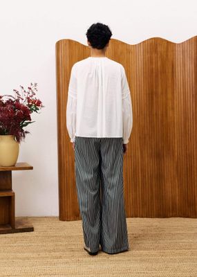 DESCRIPTION• Cotton blouse• Straight and structured cut• Exclusive FRNCH Fabric• Round neck without collar• Flatter details on the front• Long, voluminous sleeves• Invisible button closure• Buttoned cuffs• Worked yokes on the shoulders and sleeves