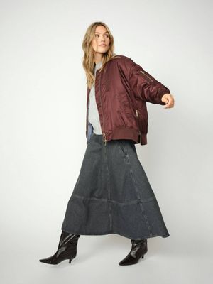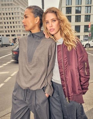 A bomber jacket is a must during the tricky transitional months. This bomber jacket has quilted inside lining and is designed in a smooth quality, finished with cool pockets, a pleat at the backside, zipper closure, an elasticated neckline, hem, and cuffs. We would pull up the sleeves and style it with just about anything from the wardrobe.