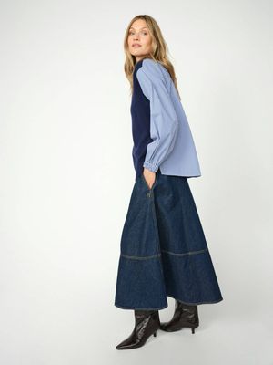 This sophisticated sweater is crafted from a luxurious wool-cotton blend, featuring a cosy knit front and a chic high neck. The contrasting shirt fabric on the sleeves and back creates a modern, layered effect, while delicate pleats at the back add graceful movement. Designed in a regular fit, this unique piece seamlessly fuses classic elegance with contemporary style.