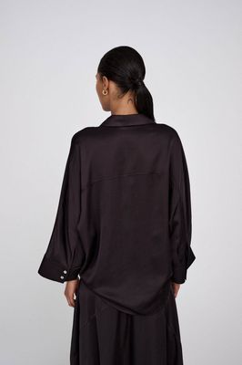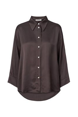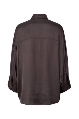 The Noabelle shirt by Rabens Saloner is a luxurious, loose fitting satin blouse in the after dark colourway, perfect for both casual and formal styling.