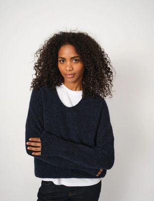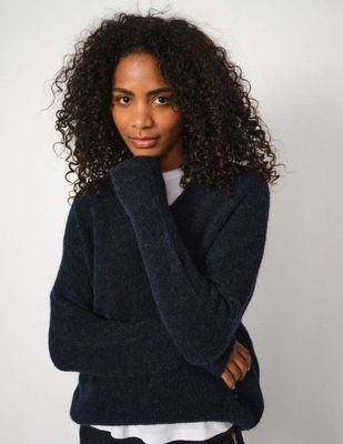 Spun from a soft blend of alpaca and responsible wool, this relaxed knit offers both warmth and effortless elegance. Designed with a flattering V-neckline and long sleeves, it drapes beautifully on the body. Wear it with jeans for a cozy everyday look or style with tailored pants for refined comfort.