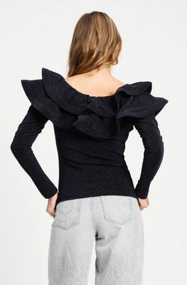 Dark blue glitter top with an off-the-shoulder ruffle – a subtle twist that adds a festive touch. Perfect for a night out with that little something extra • Dark blue • Glitter look • Off-the-shoulder ruffle neckline • Slim fit • Stretch Fit: The top has a fitted fit. The model in the photo is 170 cm tall and is wearing a size 36.