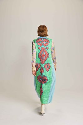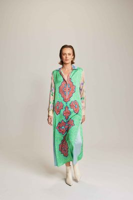 Midi length long sleeve dress with plaquet closure cuffs and collar. Contrasting side panels give extra flowiness. Wear with your favorite boots for a chic, stylish look.