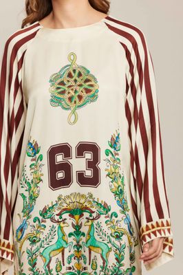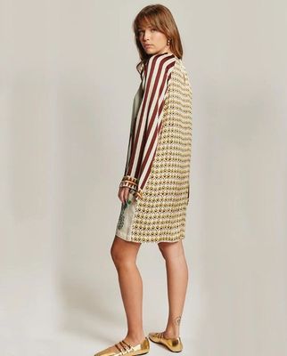 Our Alani dress comes in all three of our patterns. Dress is a mini with a rounded neck, long loose sleeves, pleats and a button closure in the back. Dress it up or down for a feminine, vibrant look.