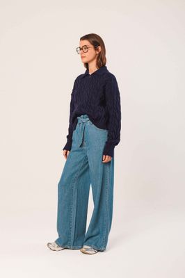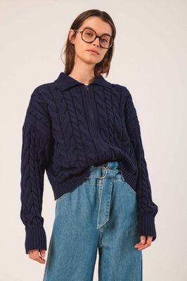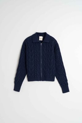 This short braided knitted cardigan is perfect to give you a little whimsy. It has dropped shoulders, a ribbed collar and a central zipper. Neutral colors make it perfect to combine with any other shade.