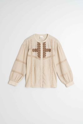 If you're looking for a romantic shirt, this is your ally for the season. Slightly dropped shoulders and balloon sleeves, plus a regular fit. Full of details like ethnic embroidery, lace inserts and pleats.