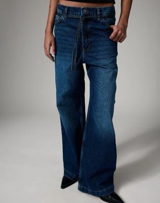 These wide-leg jeans feature a zip fly and button closure, five pockets, and a removable belt. The jeans have a loose fit and are made from 100% cotton.