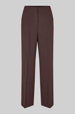 Second Female classic trousers. The trousers are made in a light fabric with drapy quality. Featuring a concealed zip, hook and button with elastic at back of waist. Two front pockets and decorative back pockets. Mid waist with wide, straight legs.