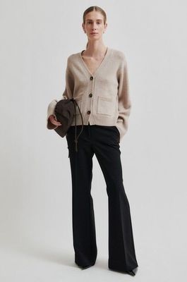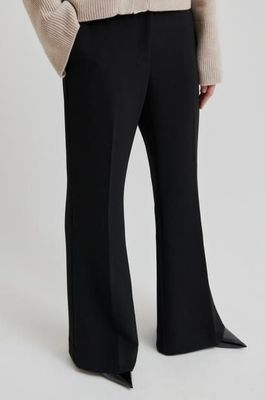 Second Female bootcut trousers. The trousers are made in smooth, drapy fabric. Featuring a concealed zip, hook and button closure. Two decorative back pockets. Mid waist with slight bootcut leg.
