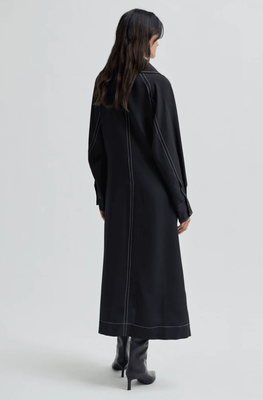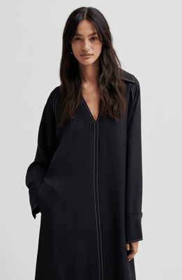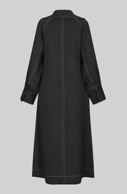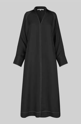 Second Female maxi dress with collar. The dress is made in a soft and drapy viscose blend with contrast stitching. Featuring an open neck with large collar and concealed side zip. Concealed side pockets. Raglan sleeves with buttoned cuffs. Slim fit.