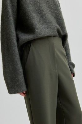 Second Female wide leg pants. The trousers are made in a light fabric with drapy quality. Featuring a concealed zip, hook and button with elastic at back of waist. Two front pockets and decorative back pockets. Mid waist with wide leg.