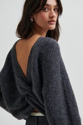 Second Female knotted pullover. The pullover is made in soft fabric with a fluffy texture. Featuring a round neck and knotted detail at the back, which can also be worn the other way. Dropped shoulders and long sleeves. Loose fit.