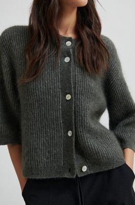 Second Female short-sleeved ribbed cardigan. The cardigan is made in a soft mohair-wool blend with ribbed structure. Featuring a round neck and button-through fastening with mother-of-pearl buttons. Dropped shoulders. Regular, slightly boxy fit.