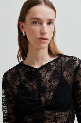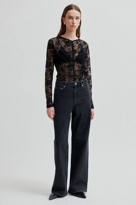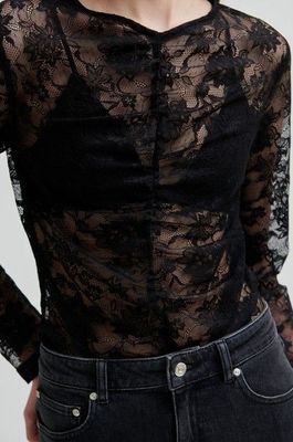 The Second Female Social Lace Tee is made in sheer, stretchy lace and features a V-neck with an elasticated gathered seam at the front. It has long sleeves and a slim fit. The tee is made from a blend of 87% Nylon and 13% Elasthane.