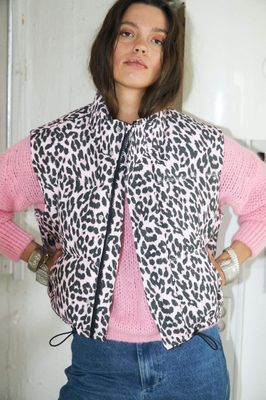 Sada is a quilted vest in a striking pink leopard print. It features a high collar and closes with a zipper and an additional snap button fastening. At the front, you’ll find pockets lined with soft teddy, while the drawstring hem allows you to adjust the fit.