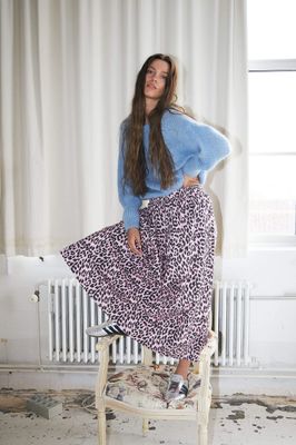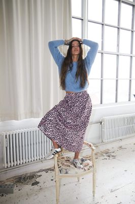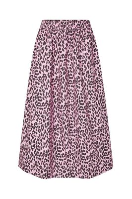 Akane is a midi-length skirt in a striking pink leopard print. It features a comfortable elastic waistband that makes it easy to wear all day and gives a relaxed look. The skirt has practical side pockets and is made of 100% cotton.